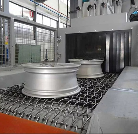 - Камера очистки изготавливается из стальных листов, изнутри обшитых съемными бронированными пластинами. Входное и выходное окна оборудованы прорезиненными, армированными и стойкими к абразиву жалюзи. На корпусе также располагаются дробемётные турбины, их количество определятся формой и размерами изделия.
