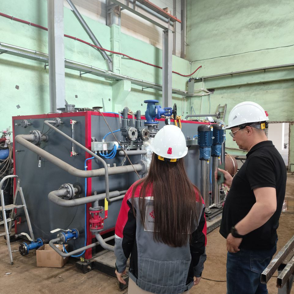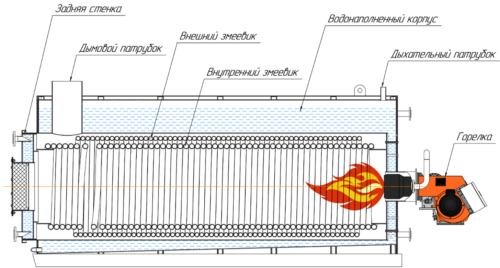 Паровой прямоточный котёл имеет запатентованную конструкцию с интегрированным экономайзером. Принцип действия прямоточных котлов основан на полном испарении воды или другой жидкости в процессе ее прохождения через спиральный змеевик. Отличительной особенностью прямоточного котла является отсутствие барабана, таким образом, не совершая движение по кругу, вода испаряется и превращается в пар в течение одного хода от 5 до 10 минут.